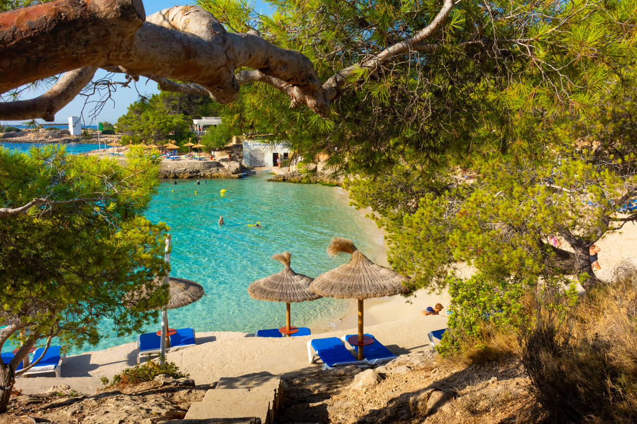 Golden sand, shallow turquoise water and pine forest setting on Mallorca’s northeast coast