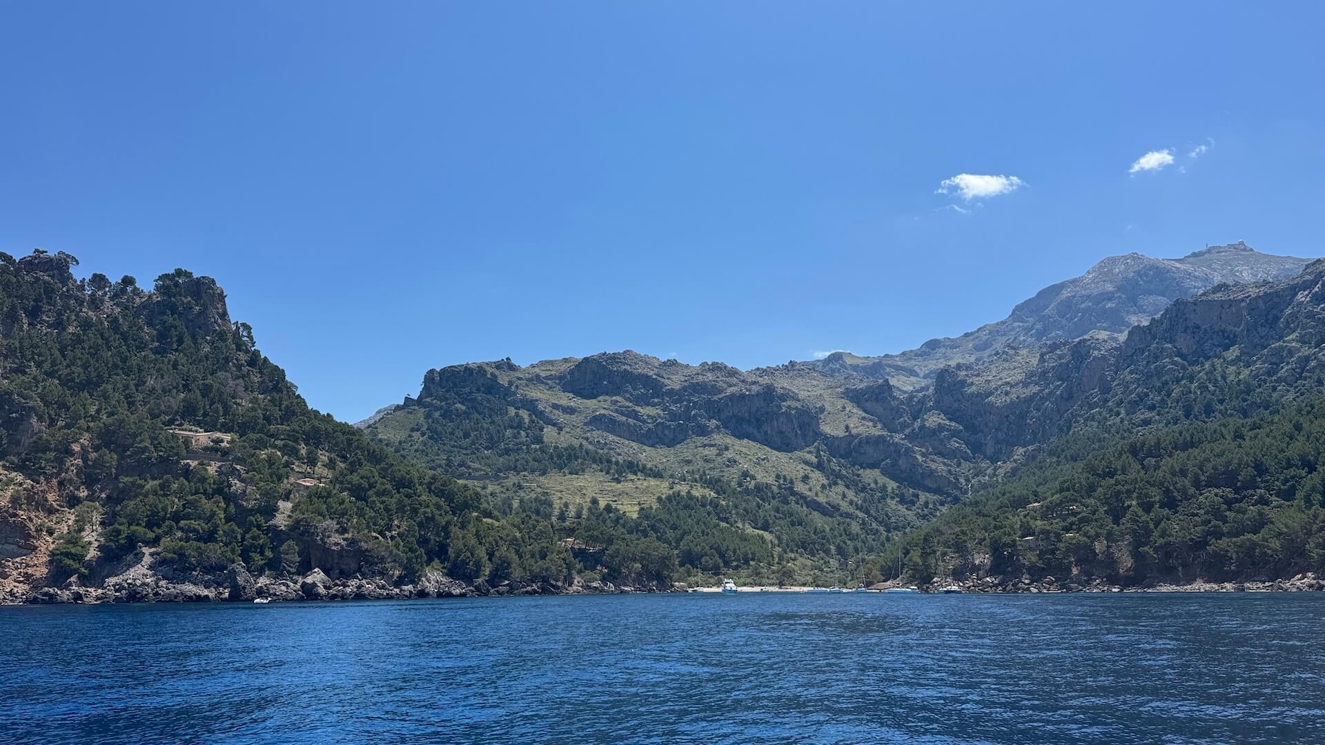 Half the fun of course, is getting there, and this journey is spectacular from start to finish. Dramatic cliffs, hidden caves, a waterfall, and turquoise swim spots along the way. As you turn into the Cala Tuent, you feel as if you’ve stumbled across Mallorca at its most unspoilt. No hotels, no crowds, just crystal clear water and pine-fronted mountain peaks.