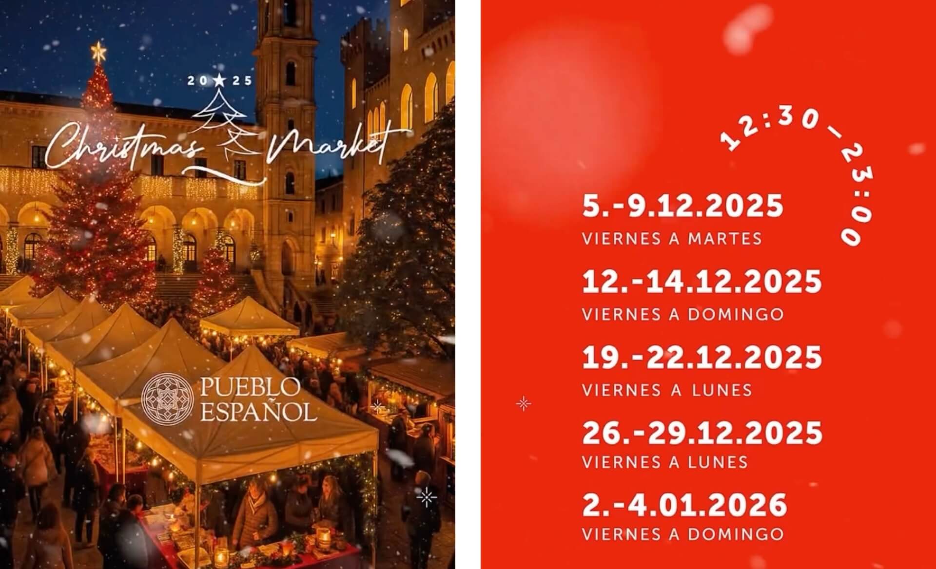 Artificial snow, Santa and the Reyes, live music, kids’ attractions, festive food with a free drink per ticket (Glühwein or Hot Chocolate), and Christmas shopping at selected stands.