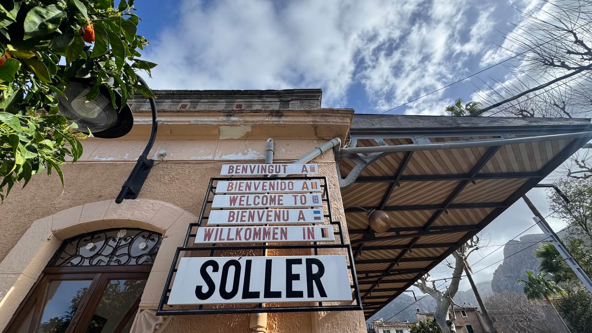 You emerge in the valley of oranges, with Sóller appearing just around the bend. One daily departure includes a ten-minute stop at the Mirador des Pujol den Banya, with views over the valley and mountains behind – check at the ticket office when you book to find out which service it is.