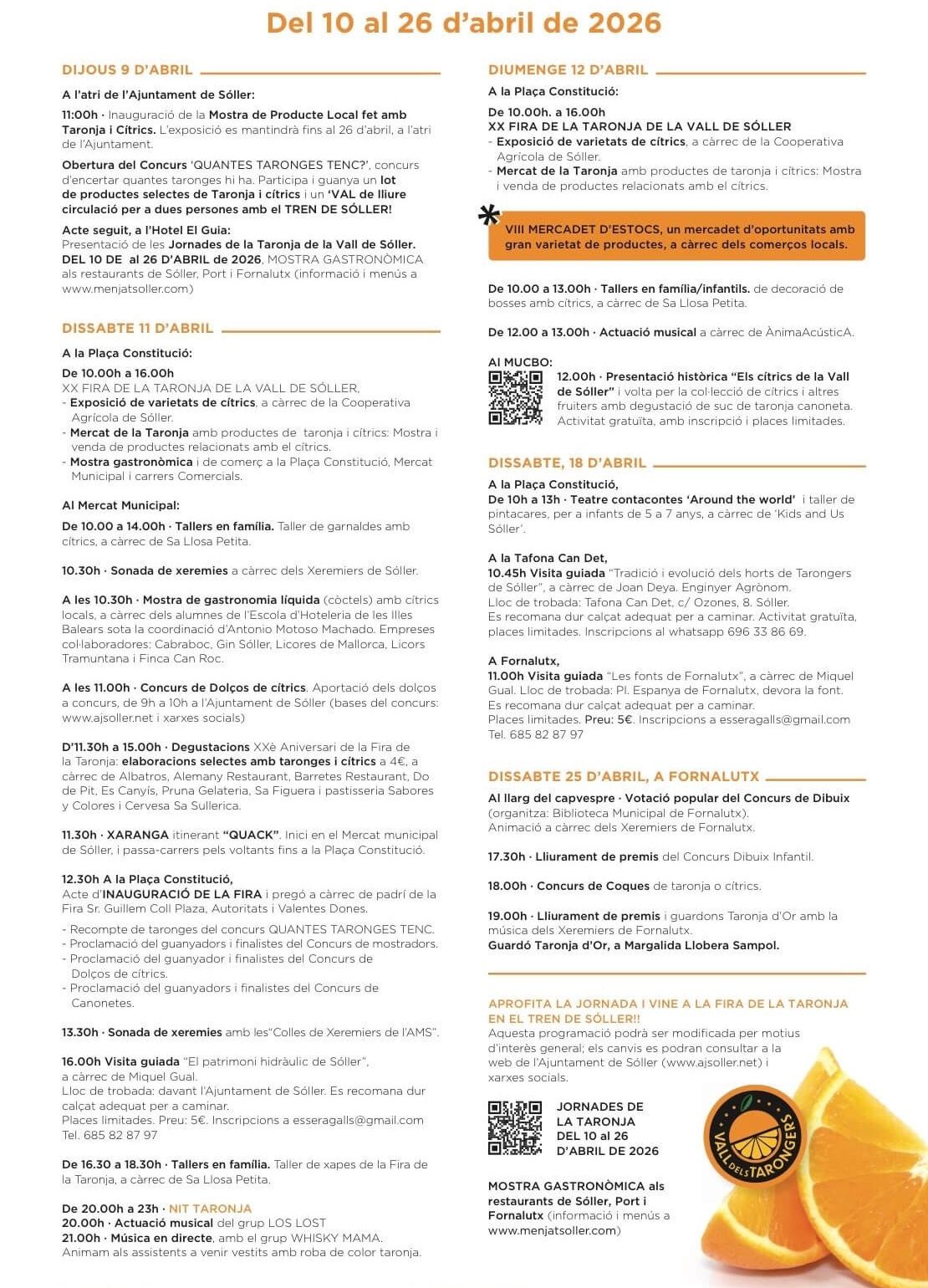 Events take place across Sóller, Port de Sóller and Fornalutx, with a wider programme running 10–26 April 2026.